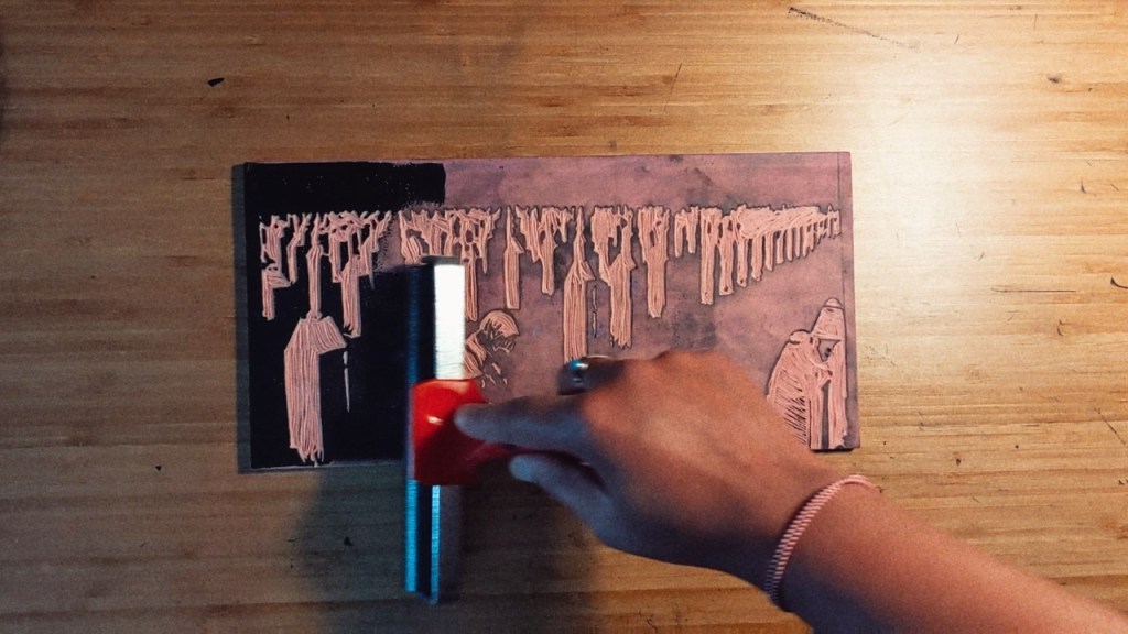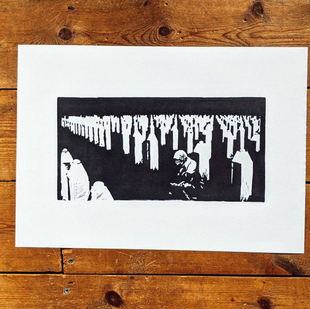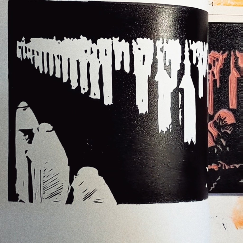 My Srebrenica print is carved on Speedball’s large 6×12” speedy carve rubber block. My style of printing has changed from the Banksyesque relief printing effect since I carved this but I don’t know if I have it in me to produce something that is so emotive.