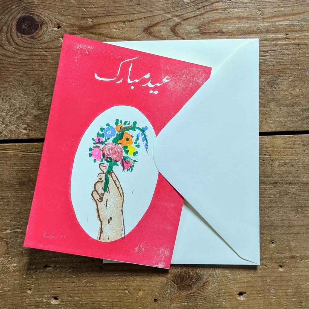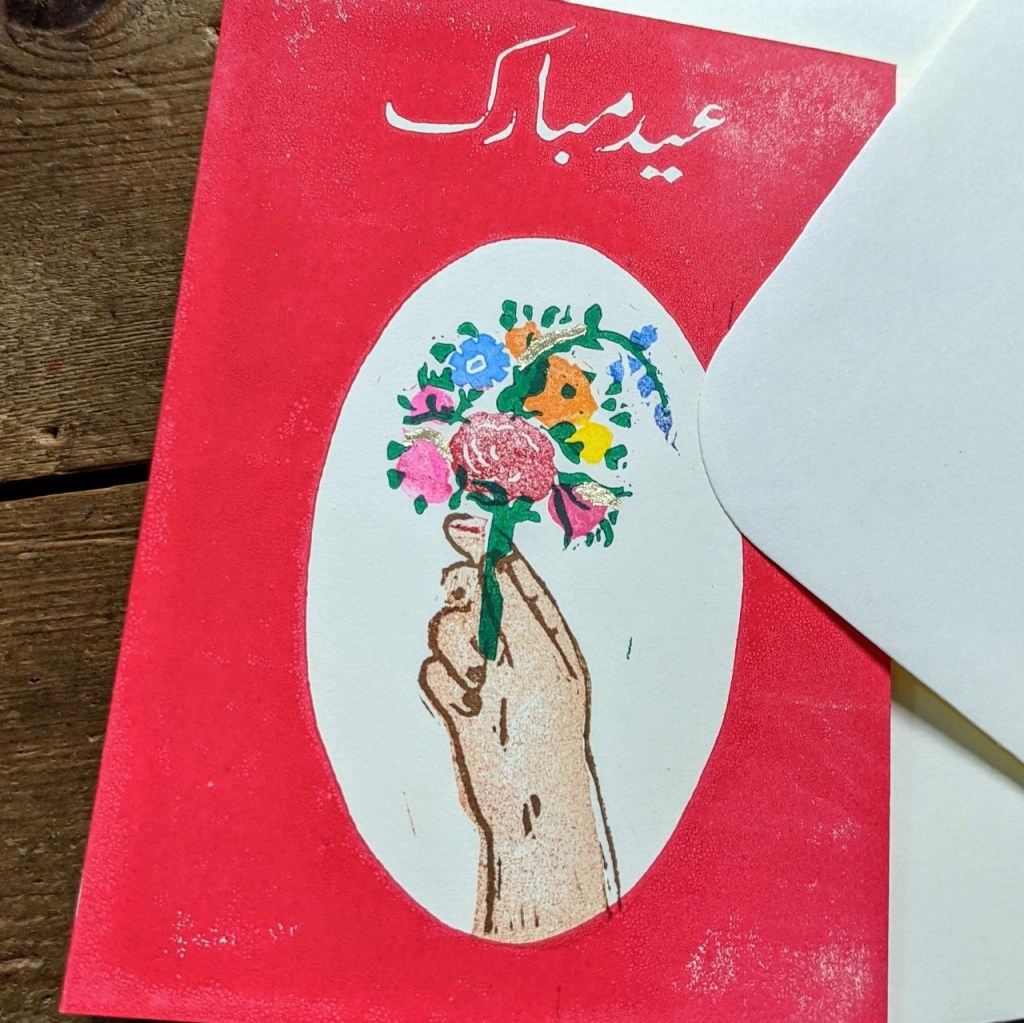 It is important to me to have shades of brown appear on the card for the hand. This is difficult to achieve using ink on a small block, but I’m mostly pleased with the outcome. I use small ink pads for the details in this print which are water based. My Eid cards are now available from my Etsy shop, link below.
