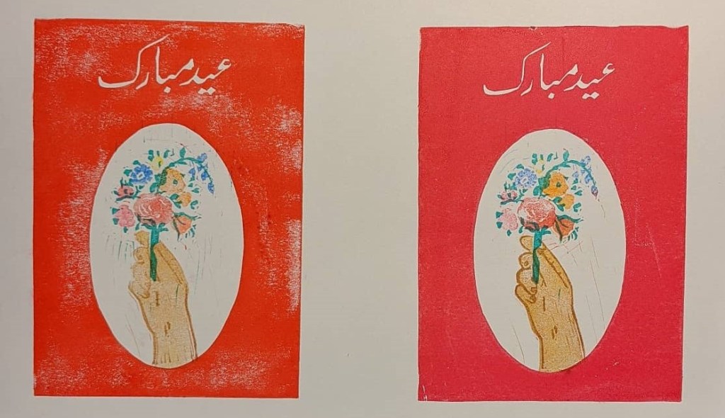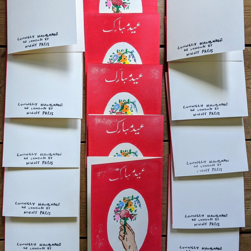My own cards have been heavily influenced by the bright colours, floral pattern and Urdu text, which I had thought was a nod to Pakistani truck art and sticker labels on glass bottles but which I now realise is attributed much further back to the designs we have seen here on the Eid cards. And in full circle mode, the imagery of the cards themselves have become an icon of the culture. The flowers are inspired by a Mughal painting of a woman I have on my tea towel – this, combined with the main plate makes up four separate layers that are applied on the card before hand finishing with gold leaf application.