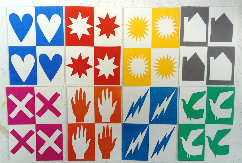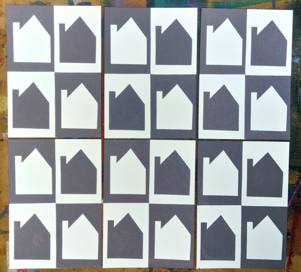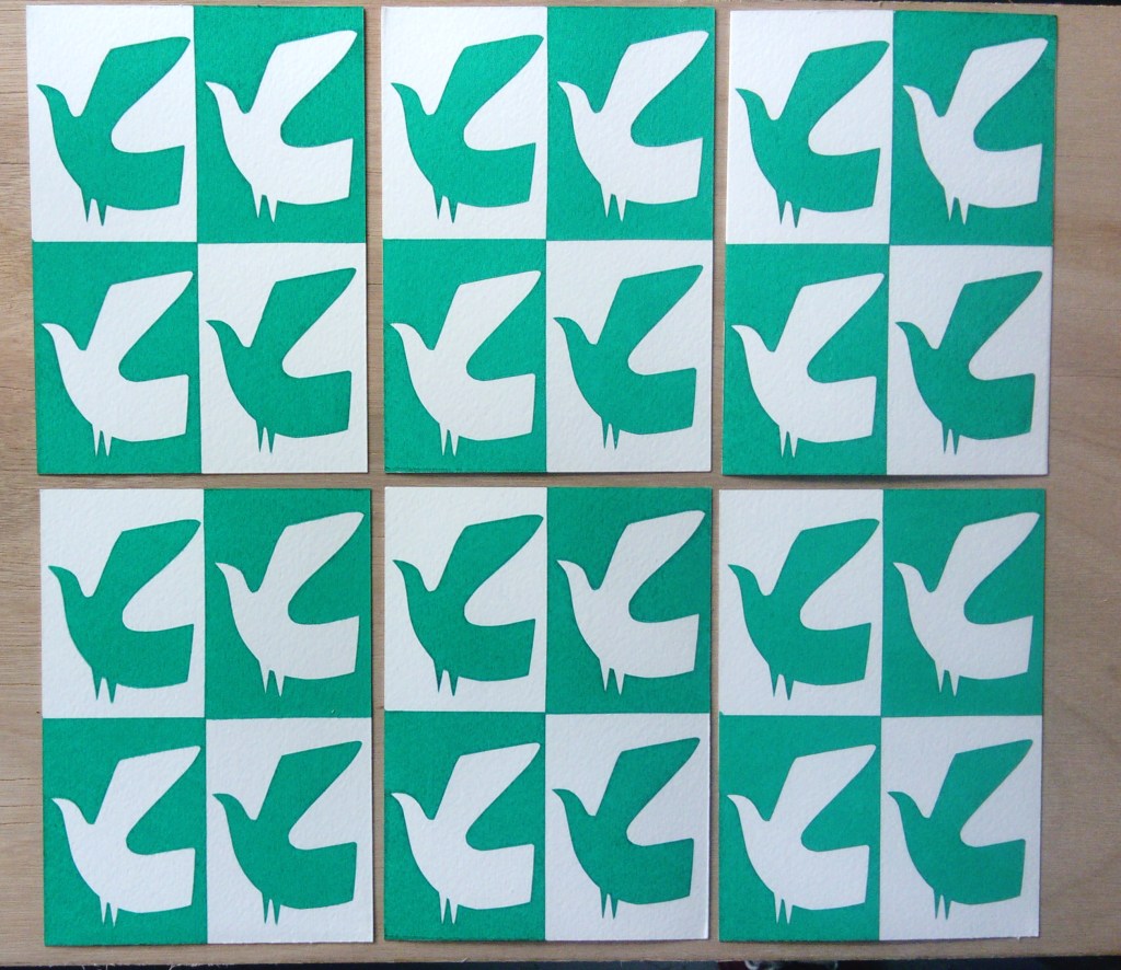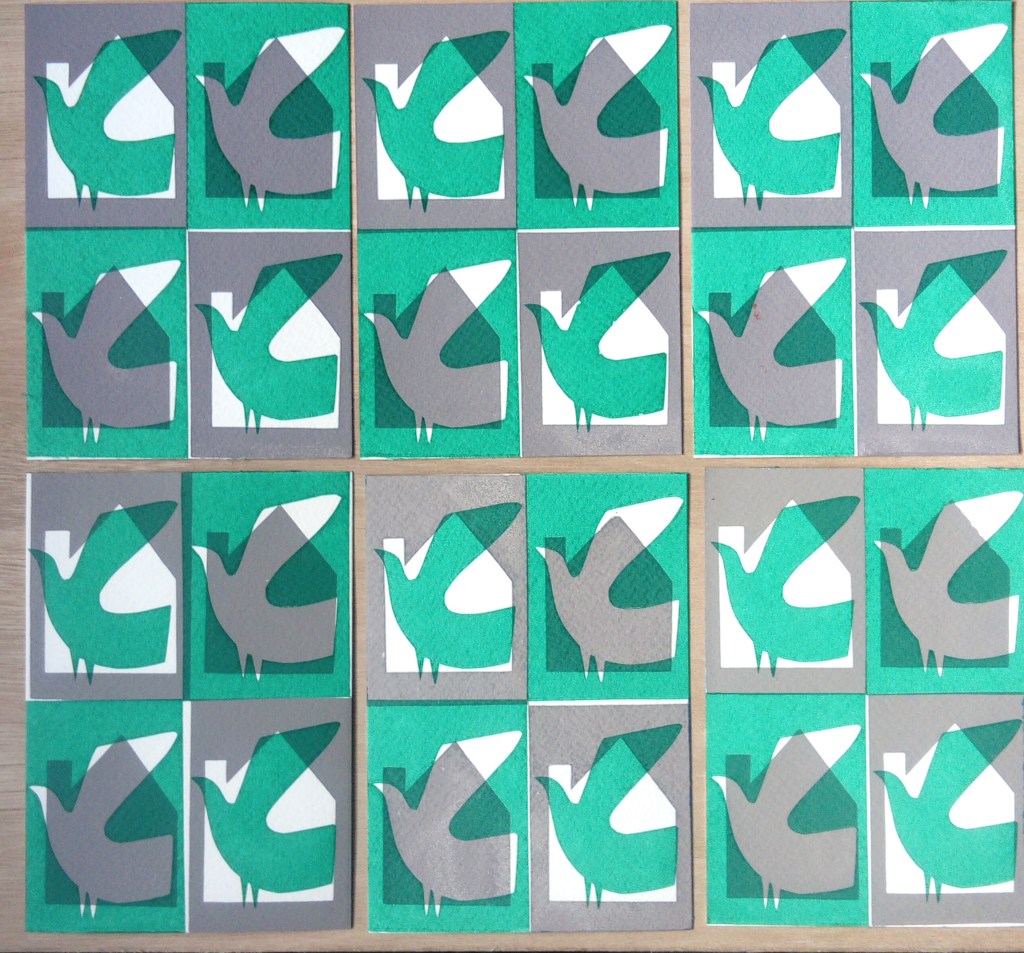 All of the series are A6 size, they are all screen prints using cut paper stencil which is my preferred way of working, I like the limitations of cut paper and also the spontaneity that you can work with. I love overprinting colours. Although I never set out to combine these images, I discovered that I could overprint two images and make a new meaning so, for example, I created a grounded bird for one image and called it “waiting to fly” but when I combined it with the house image it took on a whole new meaning and became the double edge title “couped up / set free.” The journey’s not over yet and I have a few more to add to the series but these simple images became very meaningful to me and powerful in their bold, raw simplicity.