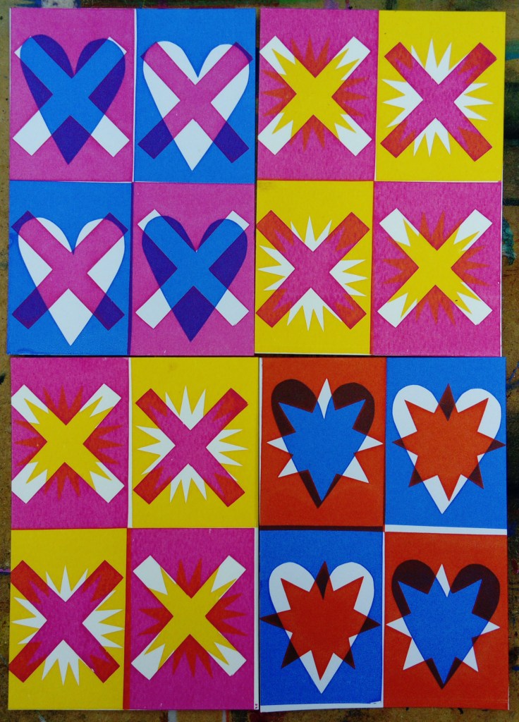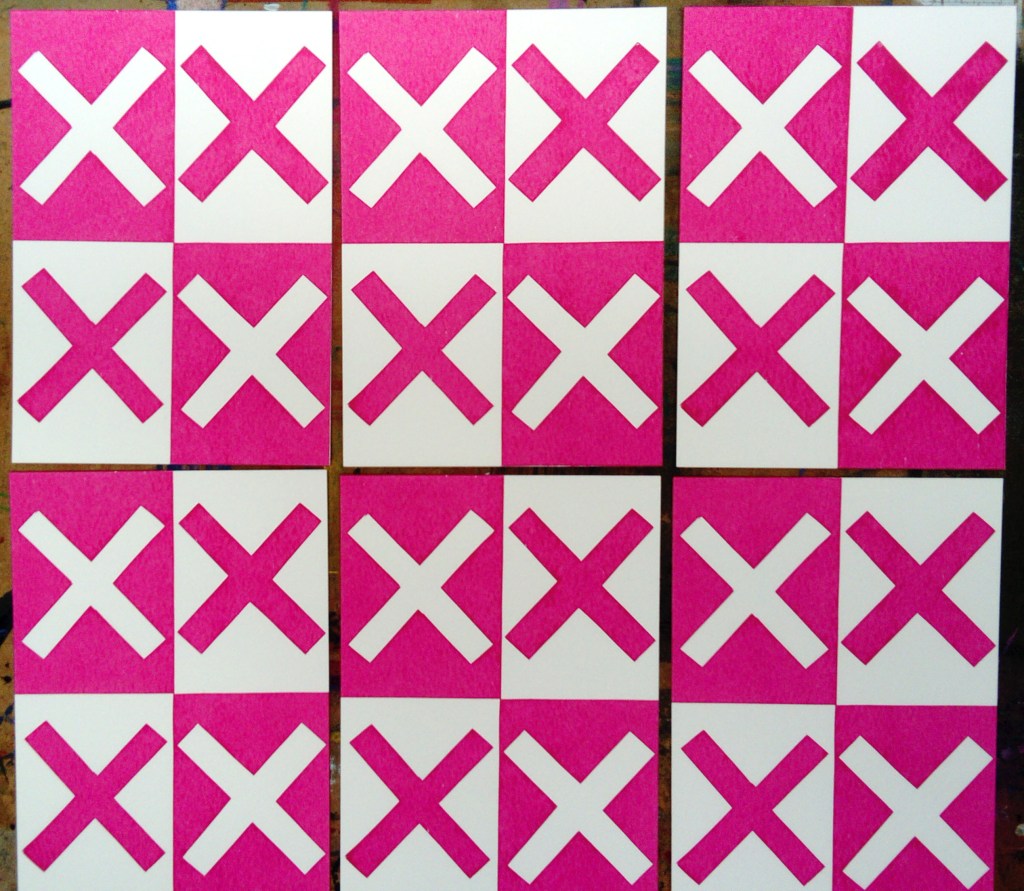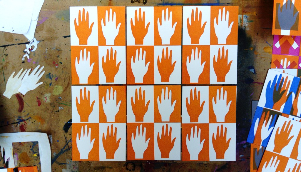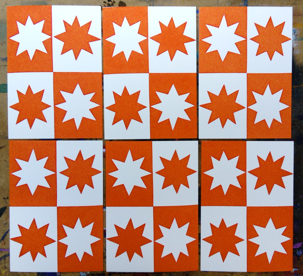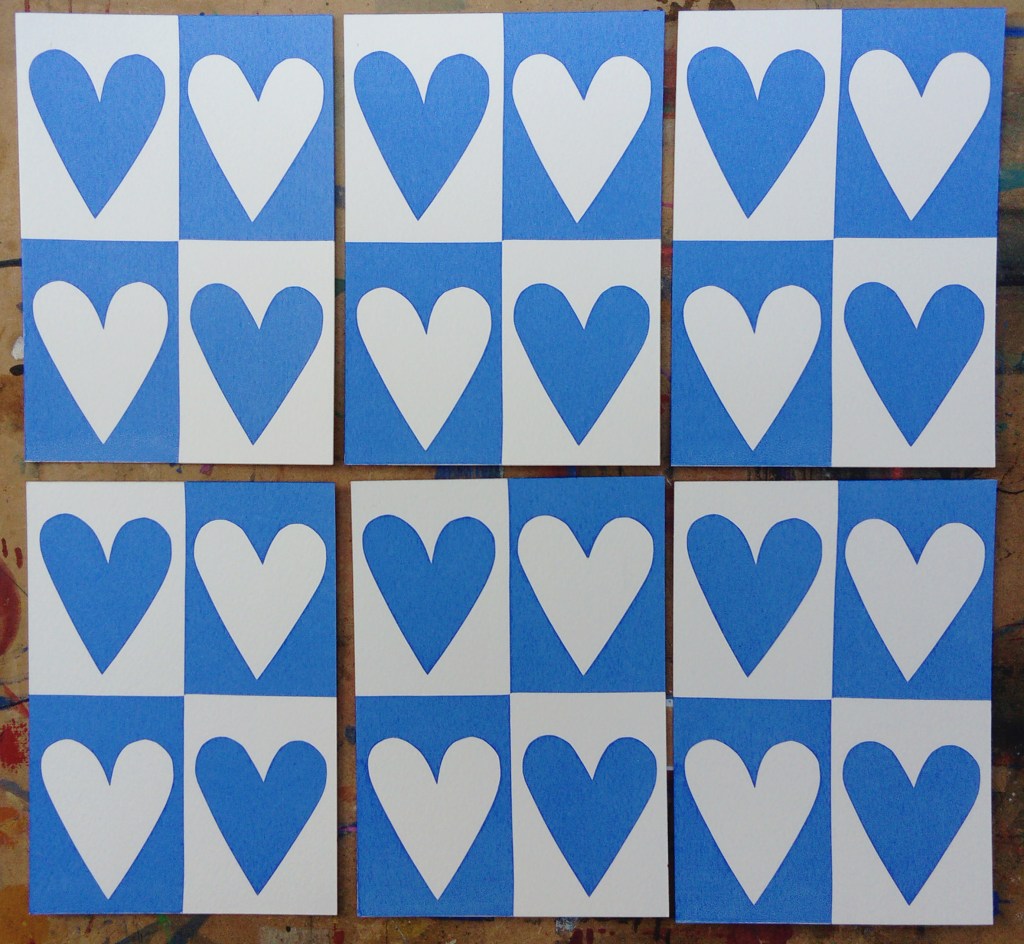All of the series are A6 size, they are all screen prints using cut paper stencil which is my preferred way of working, I like the limitations of cut paper and also the spontaneity that you can work with. I love overprinting colours. Although I never set out to combine these images, I discovered that I could overprint two images and make a new meaning so, for example, I created a grounded bird for one image and called it “waiting to fly” but when I combined it with the house image it took on a whole new meaning and became the double edge title “couped up / set free.” The journey’s not over yet and I have a few more to add to the series but these simple images became very meaningful to me and powerful in their bold, raw simplicity.