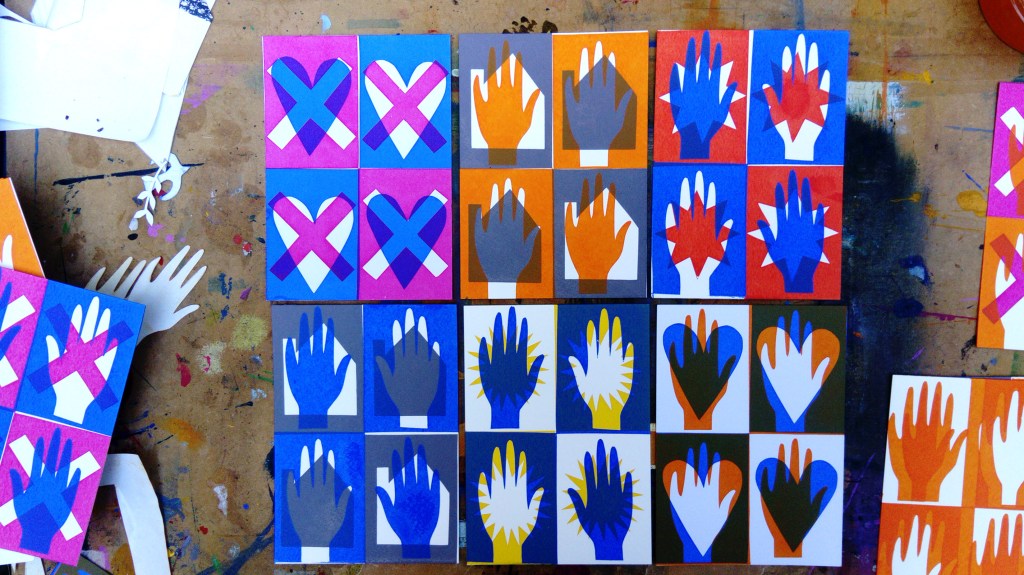 During lockdown I found it really difficult to focus, I moved a small screen print set up from my workspace back to my home, a junior sized pool table became my new work station! I started working with really simple images using positive and negative, whilst everything was unfolding, and news was changing, and our life patterns were shifting I started to think of these little shapes as amulets, or lucky charms. I called the series “Talismans for the New world” the idea being what tangible or intangible items would I take with me on the journey through lockdown to the other side. They are paired down thoughts, mixed emotions, everyone’s experiences and situations are different so perhaps others will read their own meaning into these prints.
