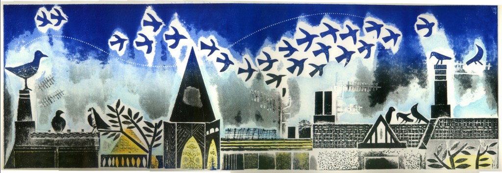 All my prints have been loosely based around my encounters with nature in an urban context. I live in a basement flat and stare up at rooftops and chimneys, seagulls drifting overhead and the constant ness of these images always crop up within my prints. On my walk from home to work, passing trees in pavements, flowers growing out of walls, birds nesting on rooftops, sitting on wire, foxes caught in lamplight, nature in cities carries on regardless of what’s thrown at it.
